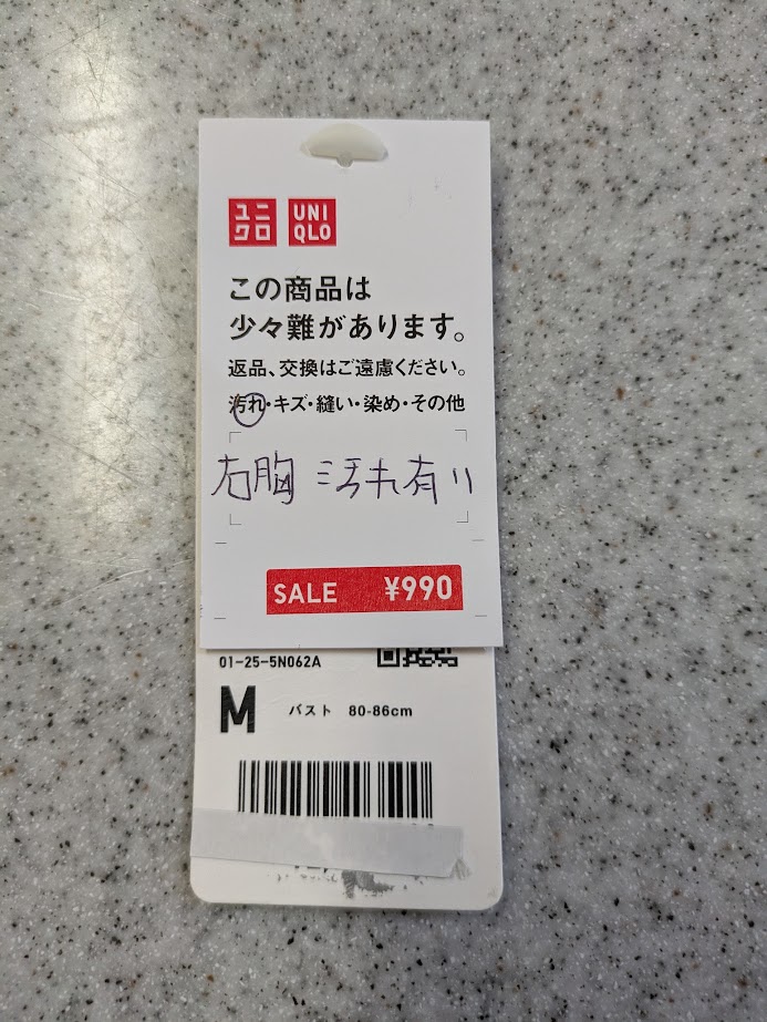汚れによる値下げです。値下げの理由が明確になっています。企業によっては、小さなPOPを使い訴求します。しかしユニクロは、専用のタグがあります。理由は、〇をつけて対応できるようになっています。