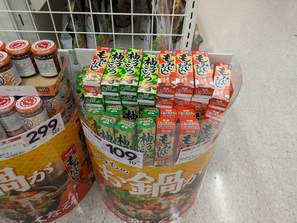 鍋のおとも、もみじおろしと柚子こしょうです。関連陳列されています。