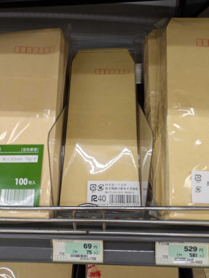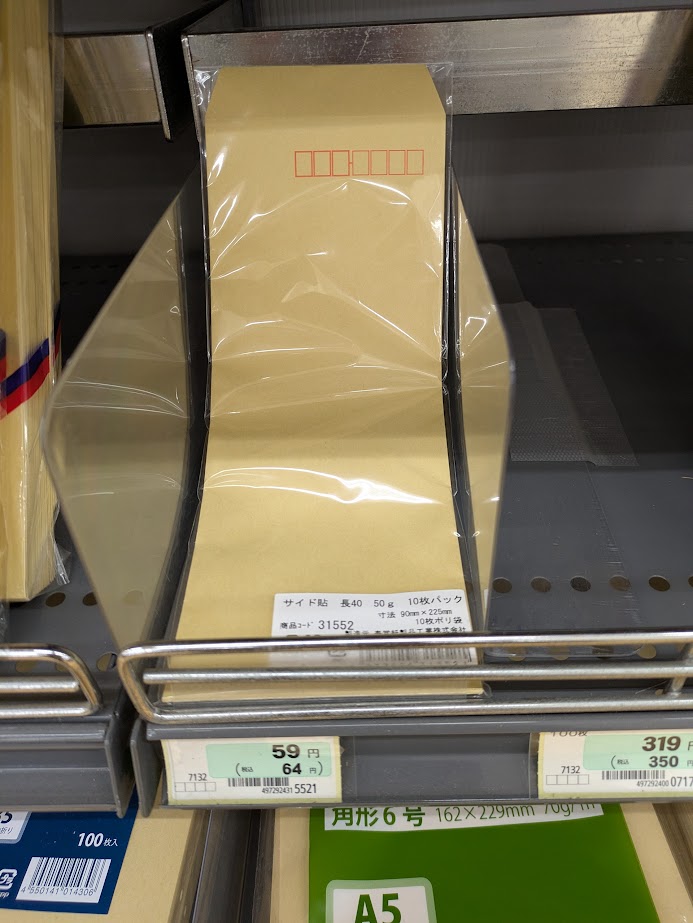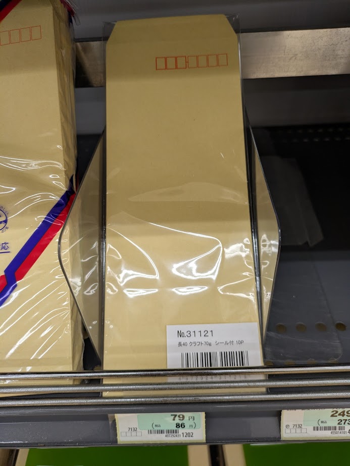 今日は、少量の商品を100円未満で販売しているケースを紹介します。例えば、封筒です。100円SHOPで購入し、数枚使用した後、しばらく使わないケースもあるのではないでしょうか。そこでホームセンターで見かけたのが10枚売りの封筒です。