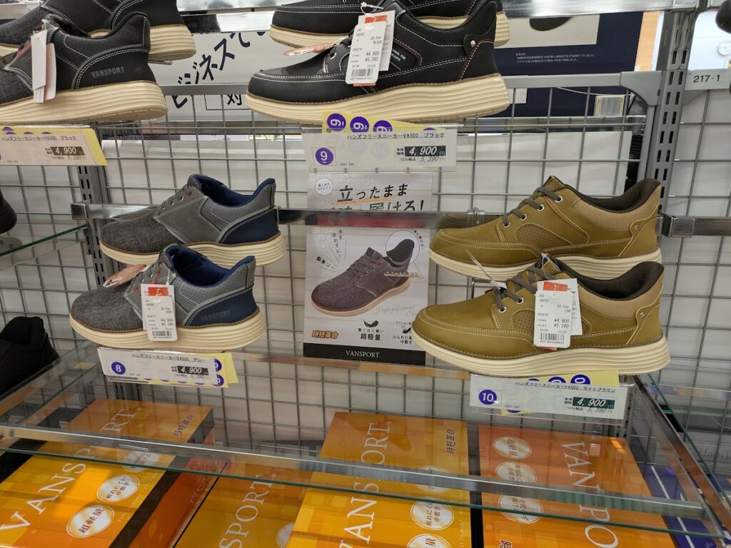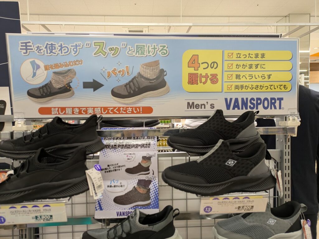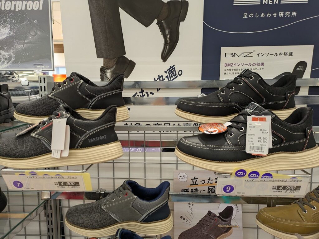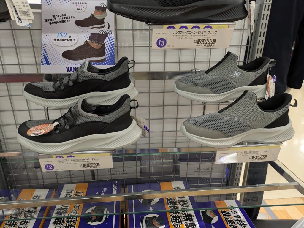 今日も簡単にはけるシューズの話題です。最近、アズビー、Mr Maxの店頭を紹介しました。今日は、ベイシアのスーパーセンターの店頭です。簡単にはけるシューズを展開していました。