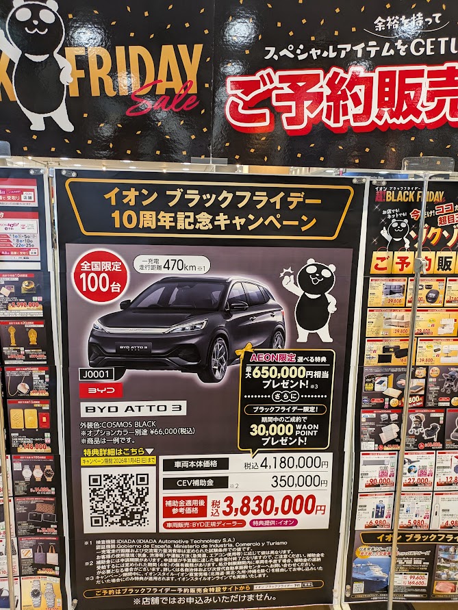 今年は、車もあります。中国のメーカーBYDの電気自動車です。SUVです。特典が豊富についています。
