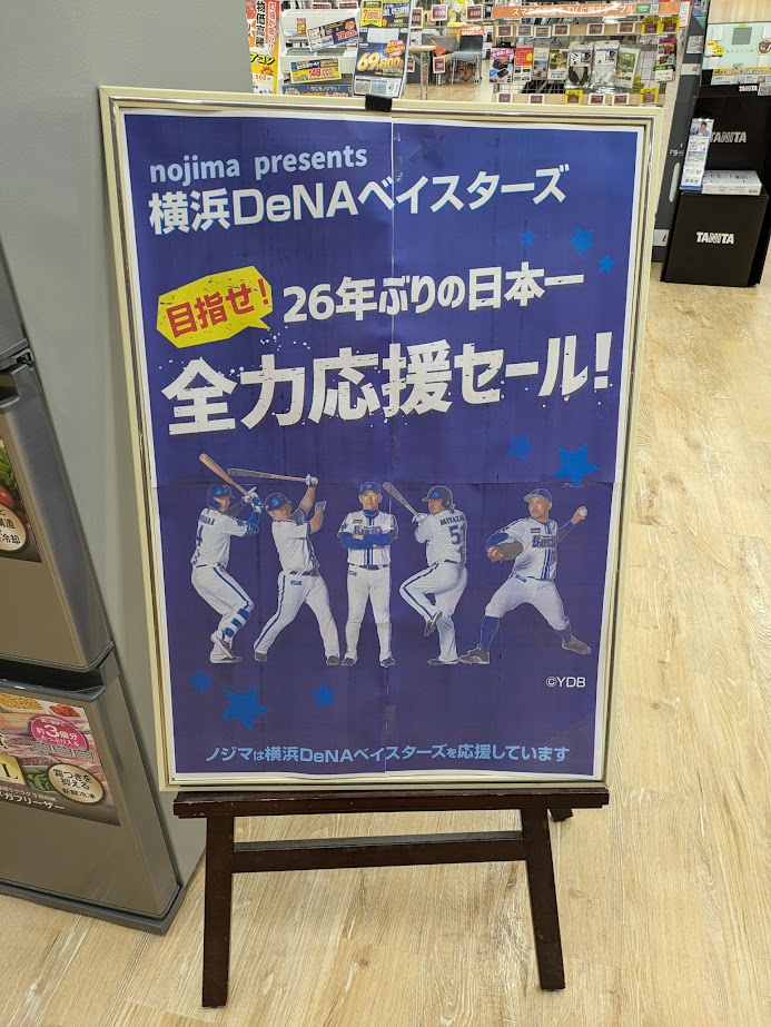 優勝すると思って準備しちゃってましたセール!!の販促物です。ノジマが冠スポンサーになっているベイスターズの優勝のことでクライマックスシリーズで敗退したためこのようになったのでしょう。とにかく、元々セールを予定していたと思います。