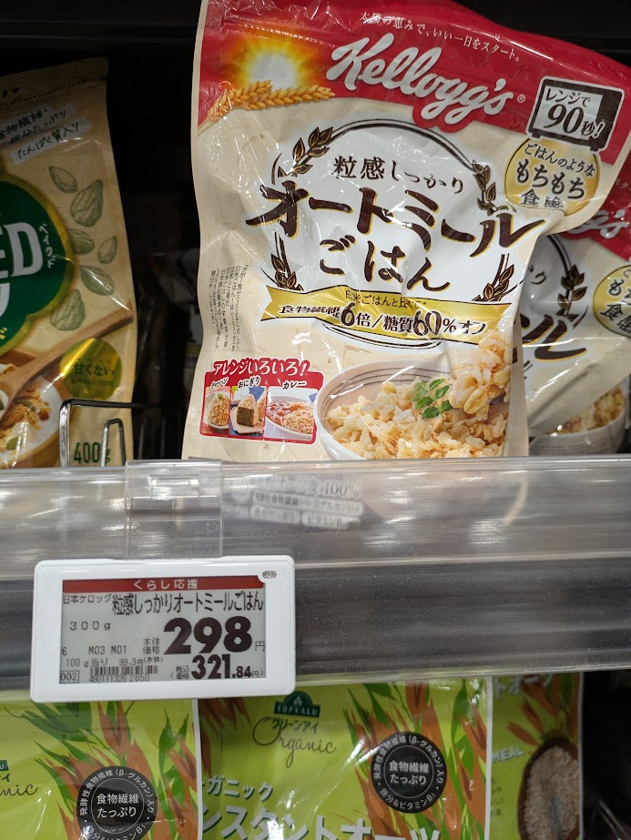 こちらは、ケロッグの商品です。「白米ごはんとくらべて食物繊維6倍/糖質60%オフ」の表示があります。食物繊維が多く、低糖質が魅力です。