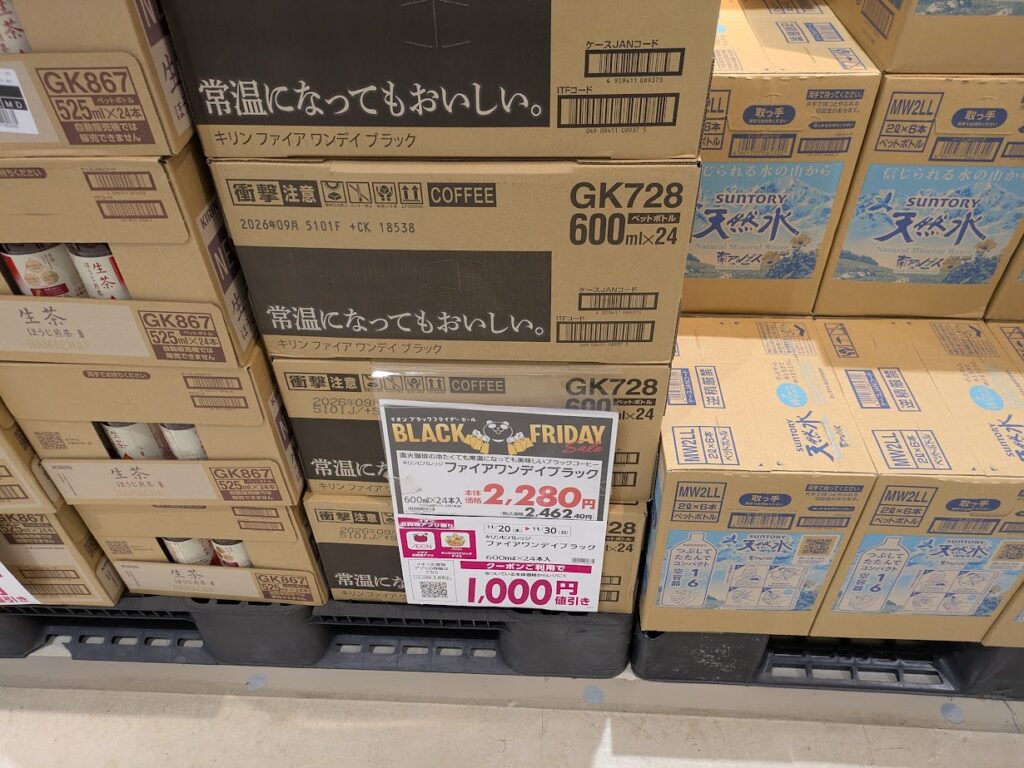 箱売りの飲料が安かったです。アプリクーポンを使うと1,000円引きです。また昨日は、お客様感謝デイなので5%引きになります。アプリ会員になるためQRコードをスキャンしているお客様も多くいました。
