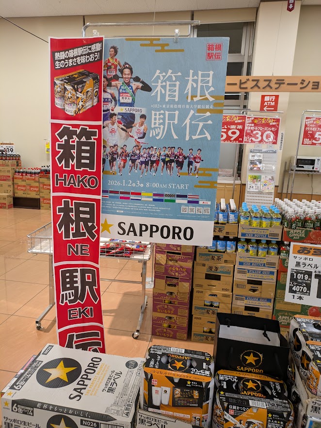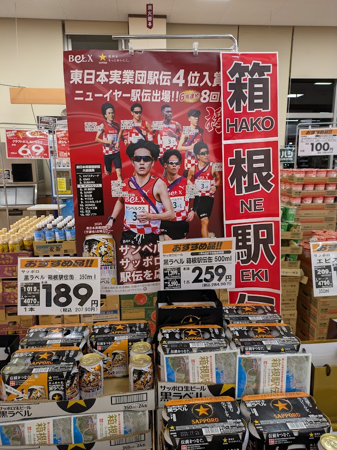先日、スーパーのベルクスで見かけたのがサッポロビールの特設売場と駅伝の応援ポスターです。