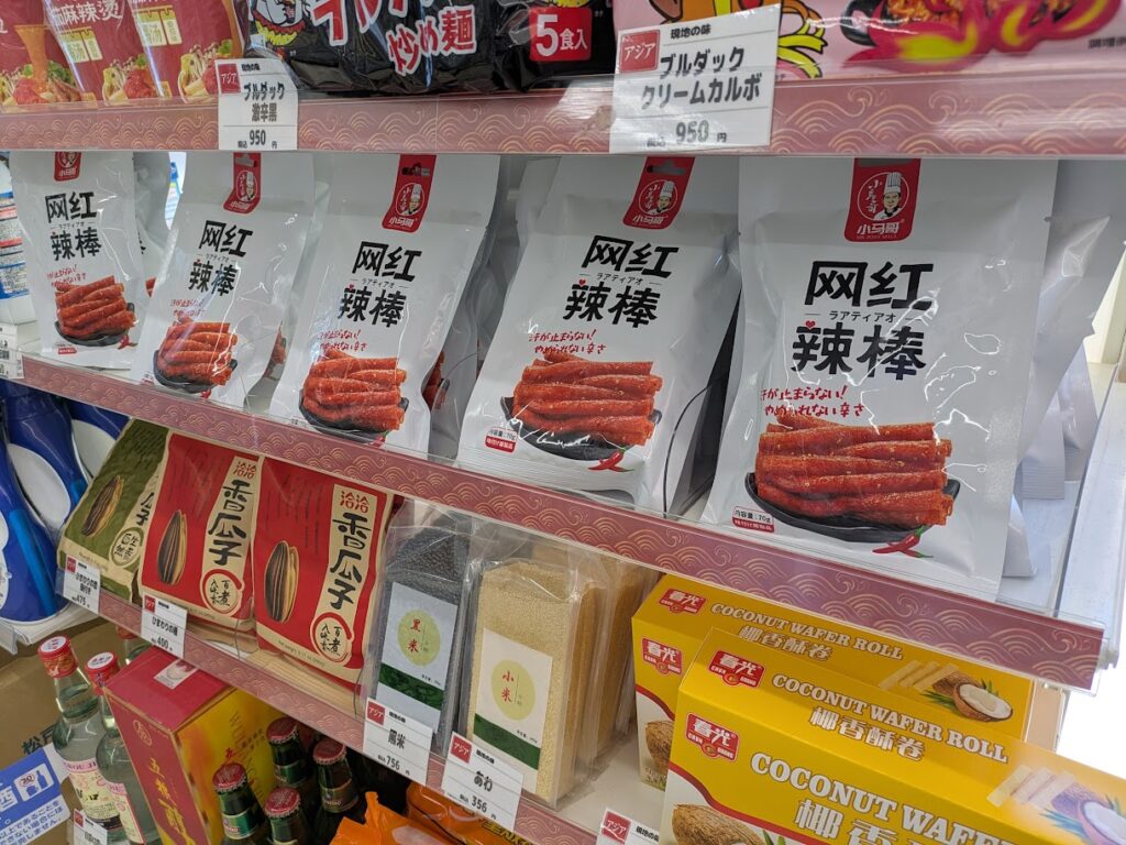 上段は、中国のスパイシーなスナック菓子です。下段には、ヒマワリの種やココナッツロールがあります。