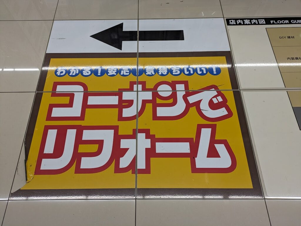 ホームセンターのコーナンの床に貼られた販促物です。