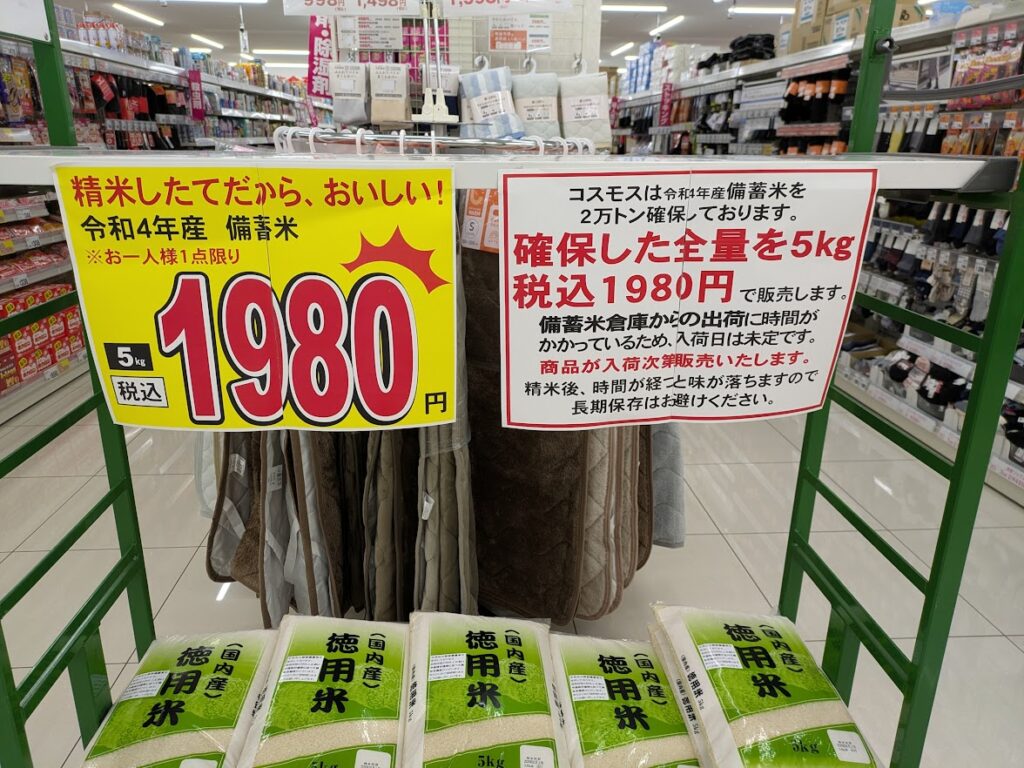 それからお米、備蓄米が放出されたときは、価格が下がりましたが、現在も高値のままです。しかし、最近でも備蓄米が見られます。昨日、ドラッグストアのコスモスの店頭で備蓄米を販売していました。