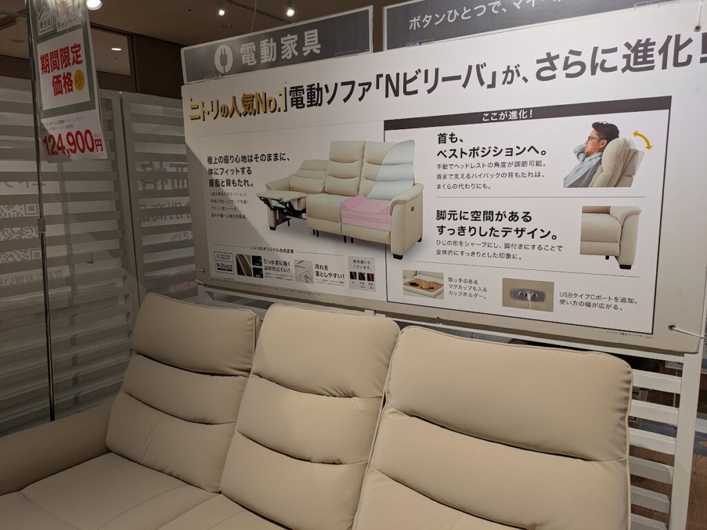 先日、ニトリの家具売場へ行った。ソファやダイニングのの椅子、パソコン用の机などを見ていた。そうするとソファや机の一部が電動で動くようになっている。元々、動くことは、知っていたが座ったりして試してみた。