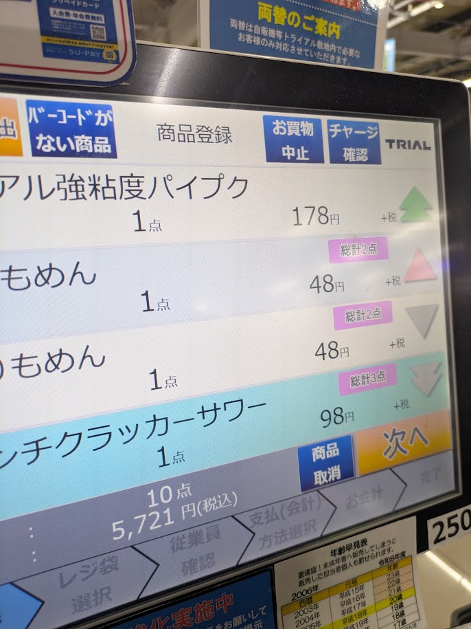 近年は、セルフレジが増えました。時間帯によっては、セルフレジのみ稼働しているところもあります。ところで最近、トライアルのセルフレジを使いましたが、感心しました。(もともと知っていましたが、今回、撮影をできたのでブログに書きます。)