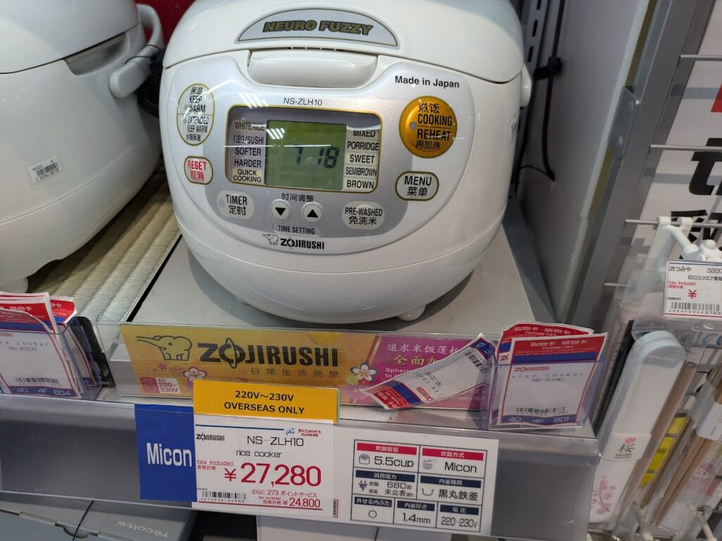 炊飯器の扱いがあります。220Vから230Vで、海外仕様です。商品自体に「Made in Japan」の表示があります。