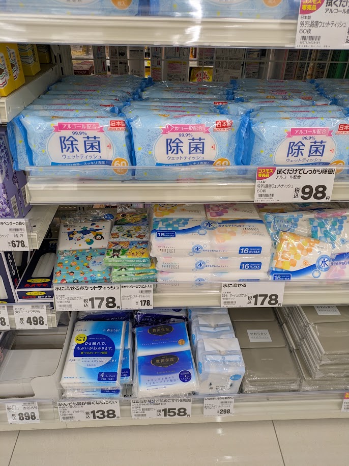 仕方なく、スタッフに聞きました。商品は、ウエットティッシュの売場にありました。ティッシュ売場からは、少し離れています。